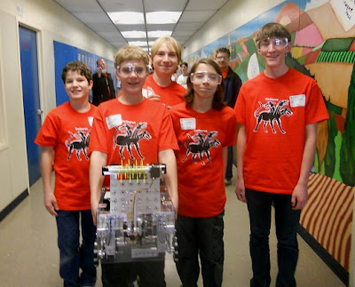 After that, it's time for the exciting part of the competition: five rounds on the robot arena, paired with different teams. Despite coming into this competition thinking of it as a "learning experience" since this was our first time, our team did really really well! Our first couple of rounds were a little shaky. Our robot acquitted itself well and our driver team of Mackenzie and Dustin turned out to be outstanding. But penalties caused by our alliance partners wiped out all of the points we gained in the first two rounds, leaving us with a score of 0! It was a little disheartening, but the kids on the team stayed very positive and were having a great time. Then things turned around and they really started getting the hang of how to partner and talk strategy with their alliance teams. By the end of the 4th round, we were in 3rd place! In the last few matches though, the top teams bumped us down and we ended in 7th, but still had a very exciting day overall.